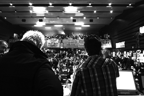 Welch große gesellschaftliche Aufmerksamkeit der Aufstand an den österreichischen Hochschulen erfährt, ist nicht nur in den traditionellen Medien, sondern vor allem auch im Internet zu erfahren. Auf der Internet-Plattform Twitter gehören die Suchbegriff-Tags „unibrennt“ und „unsereuni“ – die Schlachtrufe der Bewegung – seit Beginn der Proteste zu den meistbenutzten im deutschsprachigen Raum. Die Protestierenden geben sich dabei keineswegs öffentlichkeitsscheu und senden Video-Livestreams aus den besetzten Hörsälen in Wien, Graz, Innsbruck, Linz und Salzburg. Und das mit Riesenerfolg: Die Vollversammlungen, Diskussionsveranstaltungen und abendlichen Konzerte werden zum Teil von vielen tausend Internet-ZuschauerInnen gleichzeitig verfolgt. Auch eine anonyme Bombendrohung und die anschließende Durchsuchung des Audimax mit Polizeispürhunden (im Internet live zu verfolgen) konnte die Wiener Protestierenden nicht aus der Fasson bringen. Am vergangenen Sonntag trat die berühmte US-Punkband Antiflag in dem besetzten Hörsaal vor tausenden ZuschauerInnen auf und traf den Nerv der Bewegung: Nach einer flammenden Solidaritätsrede spielten die Pittsburgher SonyBMG-Punker den Clash-Hit „Should I stay or should I go?“, um unter tosendem Applaus die rhetorische Frage gleich selbst zu beantworten: „Definitely stay!“